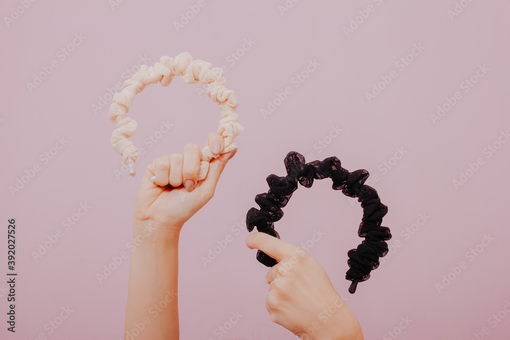Fotografie Holding handmade scrunchy or scrunchies headband fabric texture in black and beige color with pink background isolated