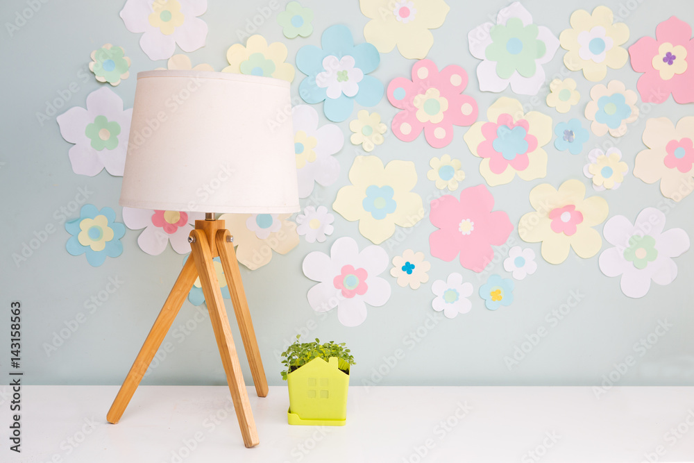 Fotografie Home interior decor with lamp and paper flowers on a wall.