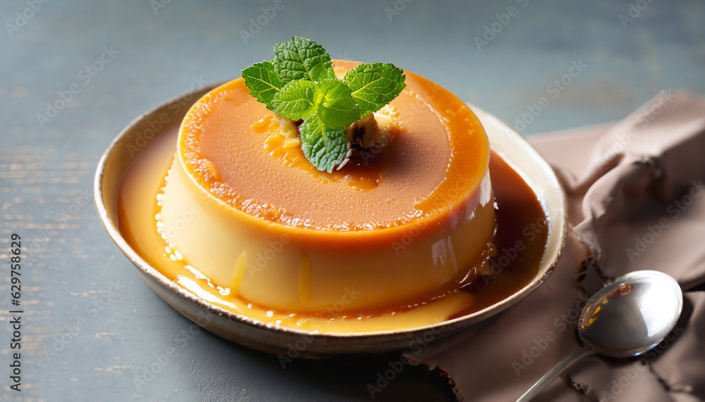 Fotografie homemade caramel custard pudding with mint