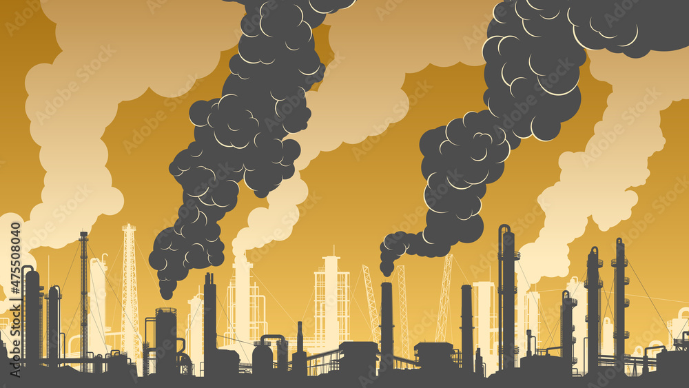 Fotografie Horizontal illustration of silhouettes of industrial zone (factories, refineries and power plants) with thick smoke from chimneys