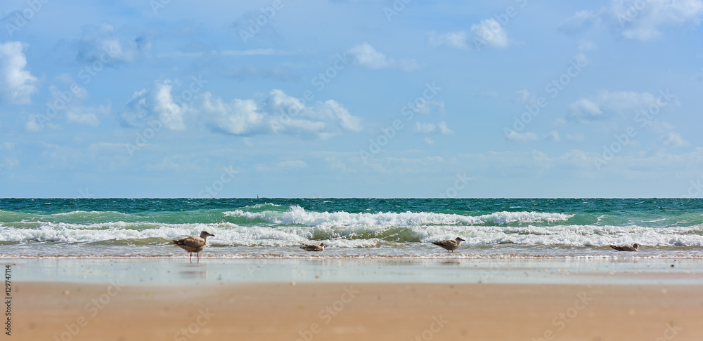 Fotografie Horizontal Sea View with seagulls, Low Angle