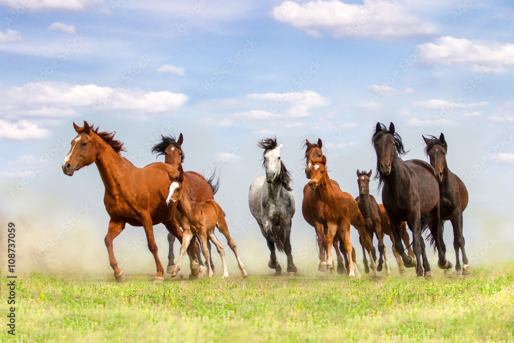 Fotografie Horse herd run on spring pasture against blue sky
