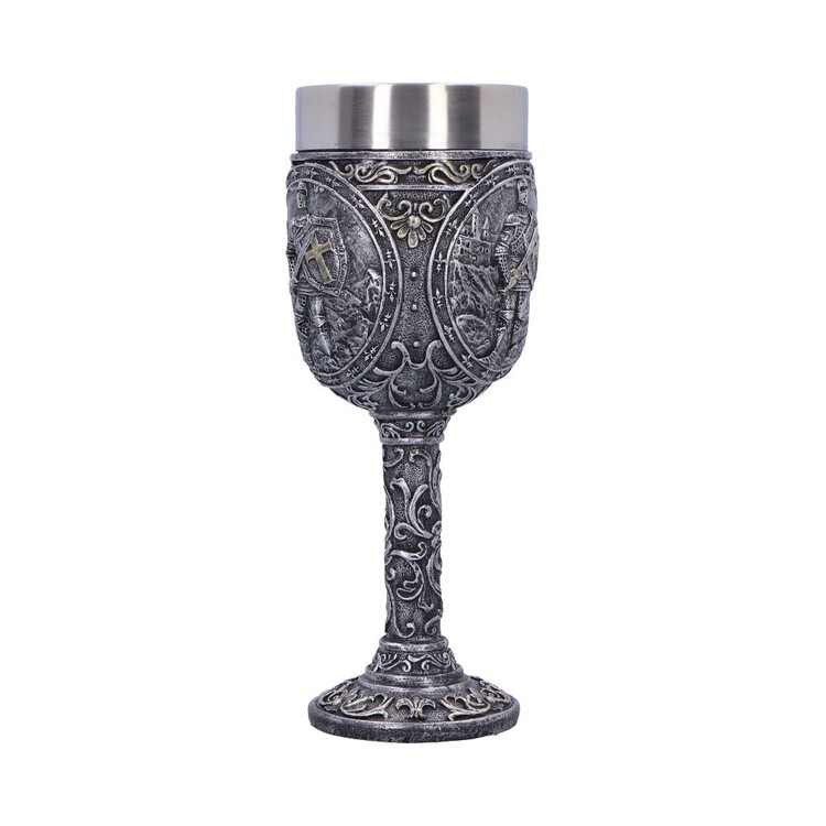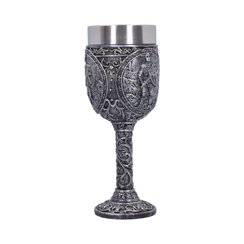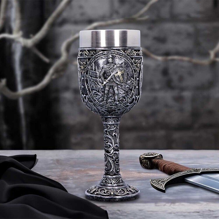 Pohár Knight of Honour od Nemesis Now obsahuje vyjímatelnou nerezovou vložku, která zajišťuje praktičnost a snadné čištění. Odlitý z vysoce kvalitní pryskyřice a ručně malovaný s důrazem na každý detail, ukazuje čtyři panely s hrdým rytířem s mečem a štítem, zasazené do dramatického prostředí hradu. Dokončený metalickými stříbrnými efekty a zlatými akcenty, jako je templářský kříž, spojuje pohár středověké umění s elegancí. Nádherně zabalený v dárkové krabičce s logem, je výrazným sběratelským kouskem nebo dárkem pro fanoušky středověké historie a fantasy.
