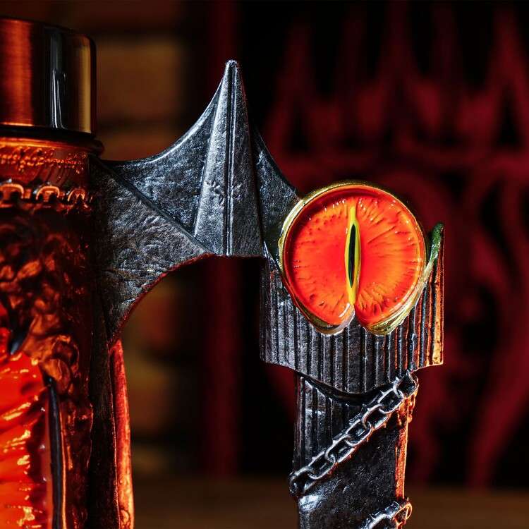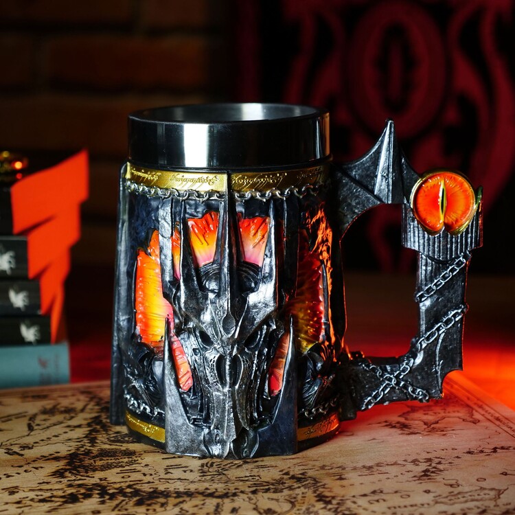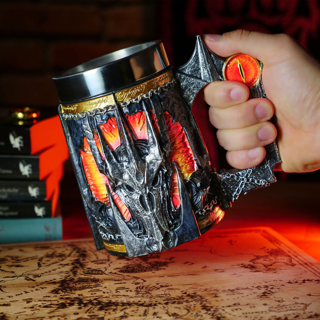 Rukojeť tohoto tankardu je tvarována podle vrchní věže Barad-Dûr, na jejímž vrcholu spočívá Oko Saurona. Tělo tankardu zobrazuje Sauronovu úhlovou přilbu obklopenou postavami dvou Nazgûlů. Kolem okraje je nápis na Jediném prstenu, který se překládá jako „Jediný prsten, který vládne všem“. Tento mistrovsky navržený kousek je odlit z nejjemnější „elfské“ pryskyřice a pečlivě ručně malovaný.