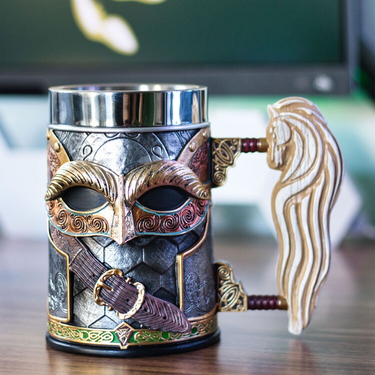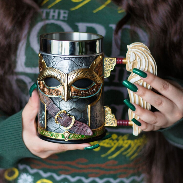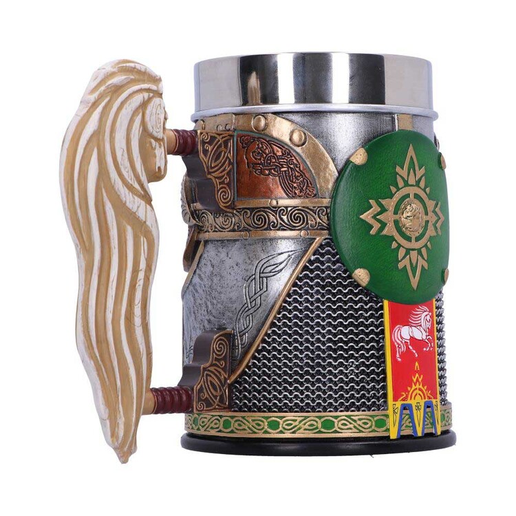 Připijte na vítězství s oficiálně licencovaným korbelem Rohan™ od Nemesis Now. Inspirován zbrojí, kterou nosili vojáci Rohanů, zahrnuje okamžitě rozpoznatelný zelený kruhový štít a detailní řetězovou košili na zadní straně korbele, stejně jako bojovou helmu a přezku na přední straně. Symbolický bílý kůň, který reprezentuje zem Rohan, se vynořuje ze strany korbele a slouží jako rukojeť. Tento nádherně navržený kus je odlité z nejkvalitnější pryskyřice „elfského“ typu a pečlivě ručně malovaný, a je perfektním doplňkem do jakékoli sbírky fanoušků Pána prstenů.