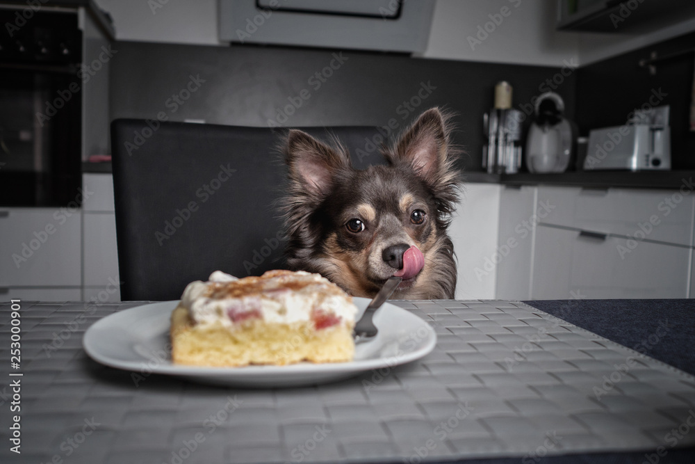 Fotografie Hund steht sitzt am tisch und starrt auf kuchen auf teller mit gabel und leckt s