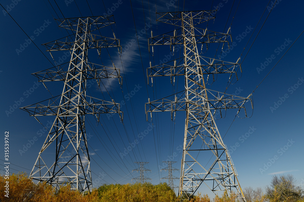 Fotografie Hydro towers against blue sky in the Fall in Ontario