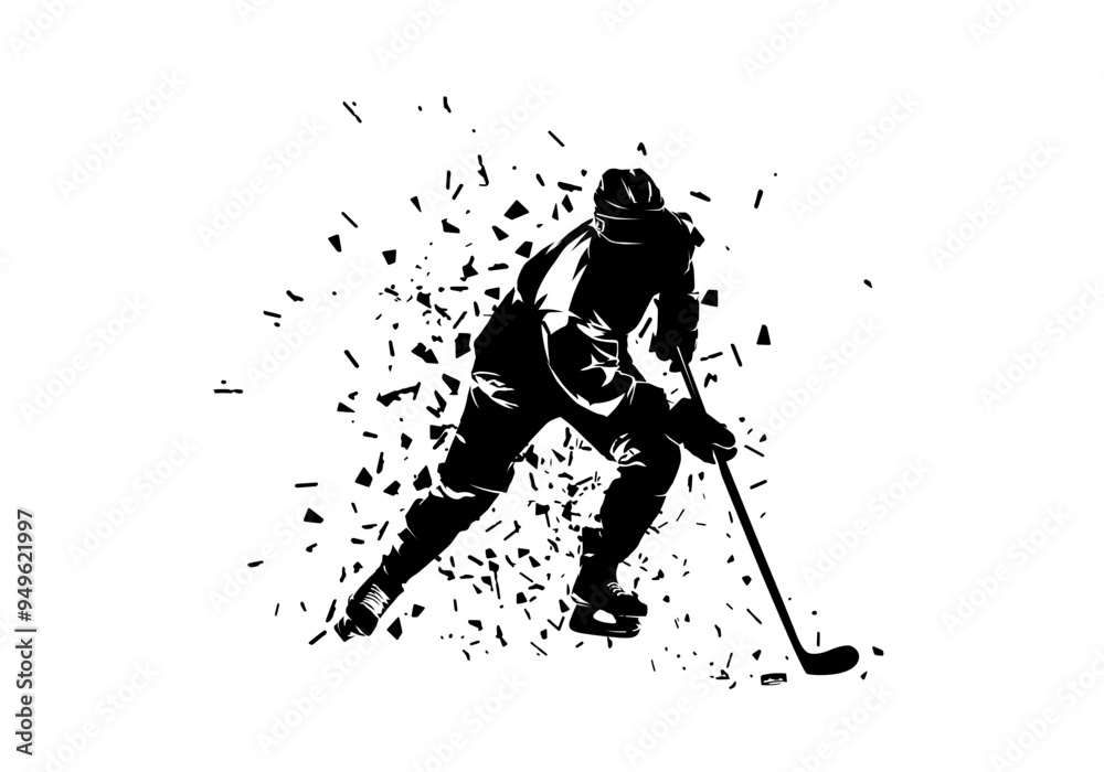 Fotografie Ice hockey, hockey player shooting puck, isolated vector silhouette with distort