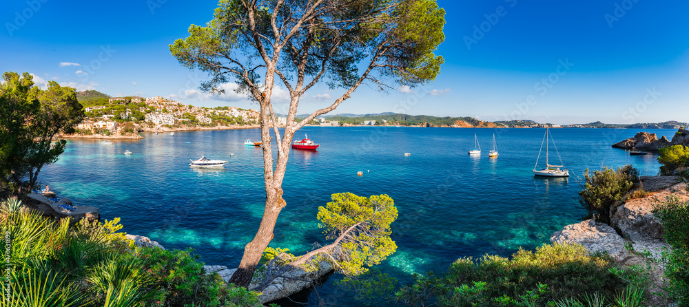 Obraz na plátně Idyllic panorama island scenery of bay with boats at Cala Fornells on Majorca is