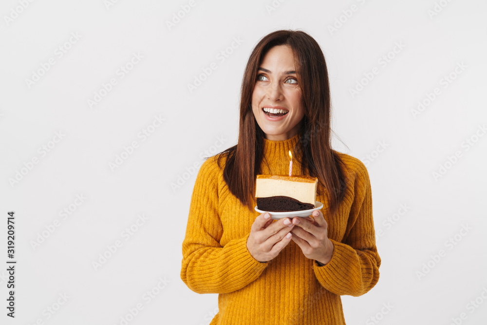 Fotografie Image of beautiful brunette adult woman smiling and holding birthday cake