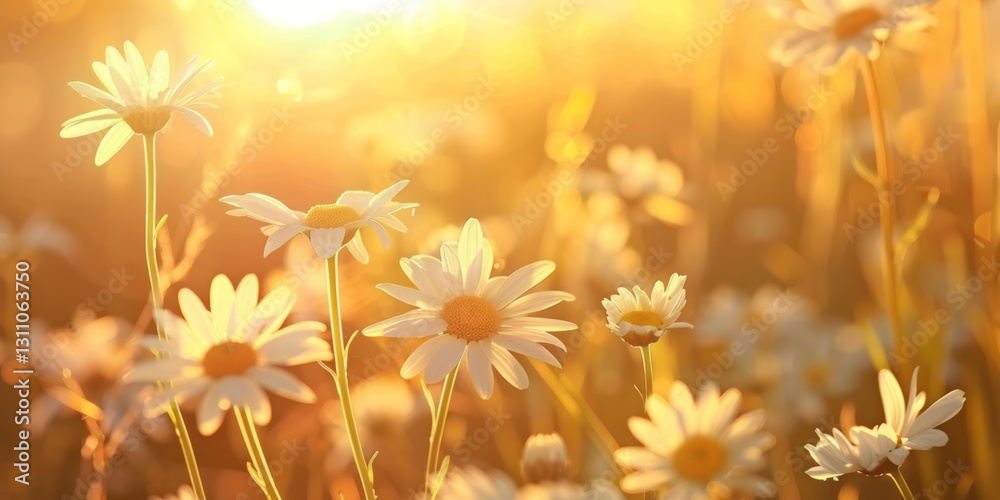 Fotografie In the golden hour, a field of daisies basks in soft sunlight, creating a warm and inviting atmosphere with a focus on the delicate petals of each flower