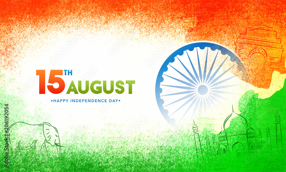 Fotografie Indian Independence Day celebration concept with stylish text, elephant, Ashoka Wheel, and Indian Monuments