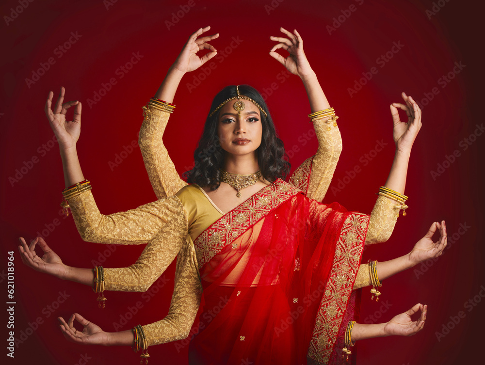 Fotografie Indian woman, portrait and goddess with many hands in studio background with sari and jewellery