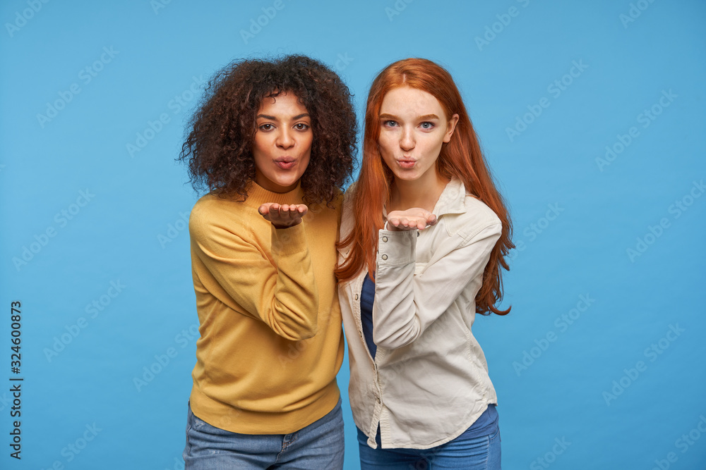 Fotografie Indoor shot of positive charming young pretty women raising their palms and fold