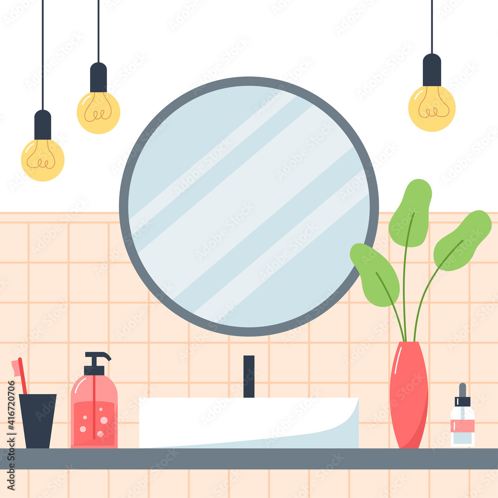Fotografie Interior of bathroom with washbasin and round mirror, flat style