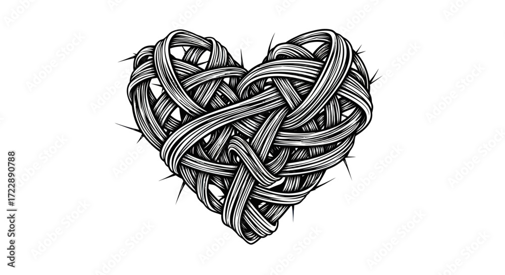 Fotografie Intricate woven heart shape interlaced and surrounded by thorns on a white backd