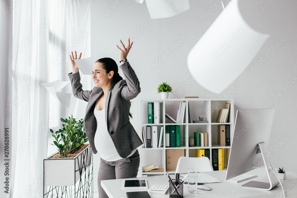 Obraz na plátně irritated pregnant woman throwing papers in air while standing near table in off