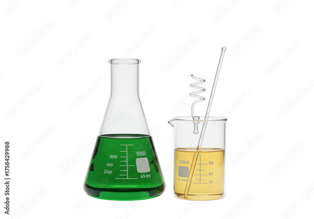 Fotografie Isolated Erlenmeyer flask with green liquid next to beaker and glass distillatio