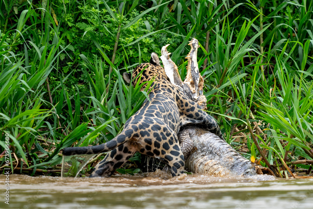 Fotografie jaguar and dead cayman in Pantanal jungle
