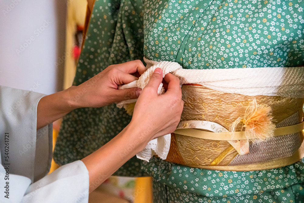 Fotografie Japanese, Okinawan woman's hands tying obiage cloth around the obi during tradit