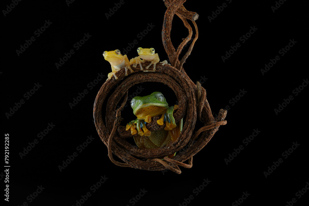 Fotografie Javan tree frog sleeping on a branch, Flying frog sitting on a wood, isolated on black background