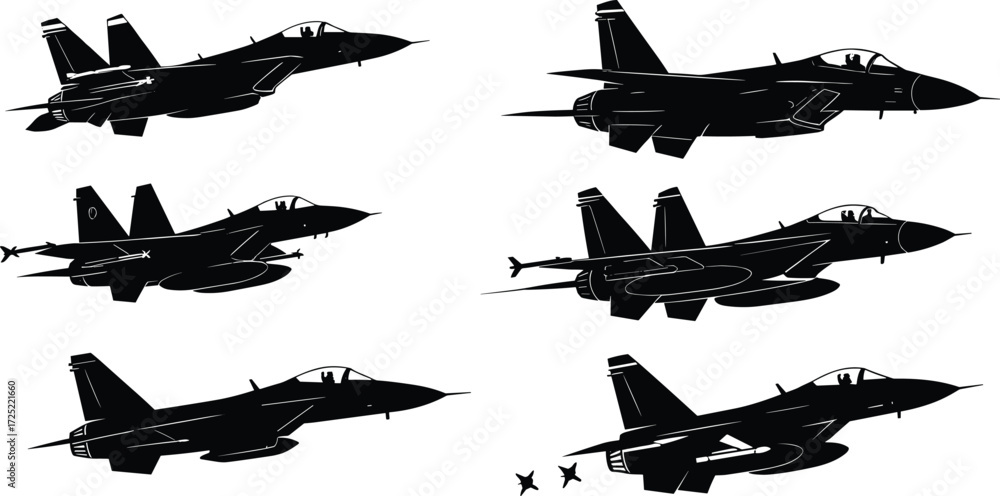 Fotografie Jet fighter aircraft vector set, military plane silhouettes, warplane illustrati