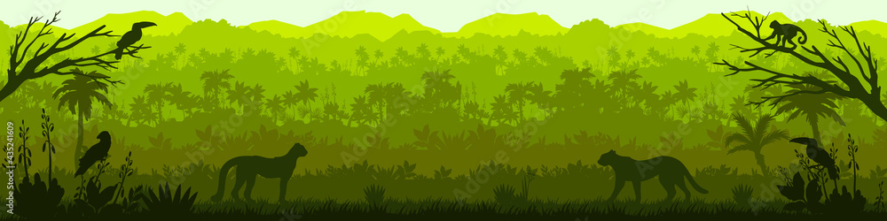Fotografie Jungle forest vector silhouette, green tropical nature background, amazon rainforest panoramic landscape