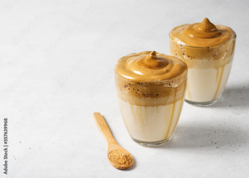Obraz na plátně Korean dalgona coffee with brown foam in glass close up on white background