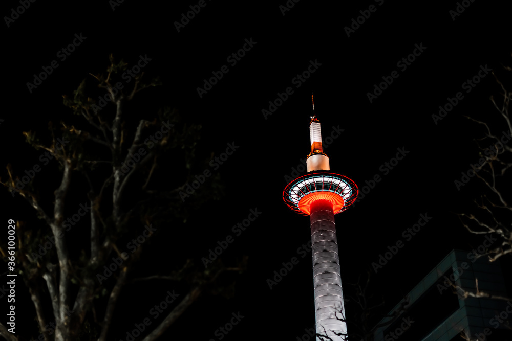 Fotografie Kyoto, Japan skyline tower near train station during dark black night and illumi