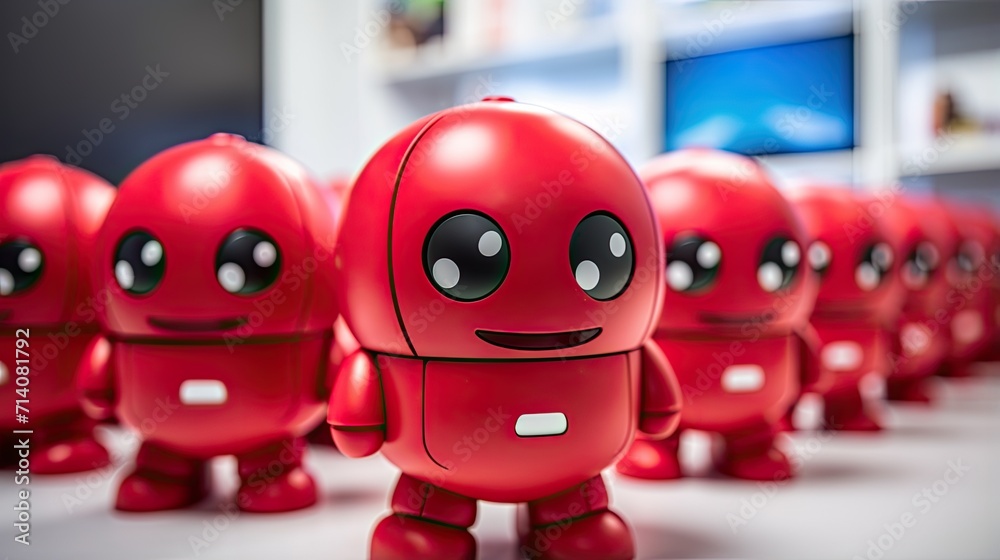 Fotografie Large warehouse of robots in production with selective focus on a single cyborg