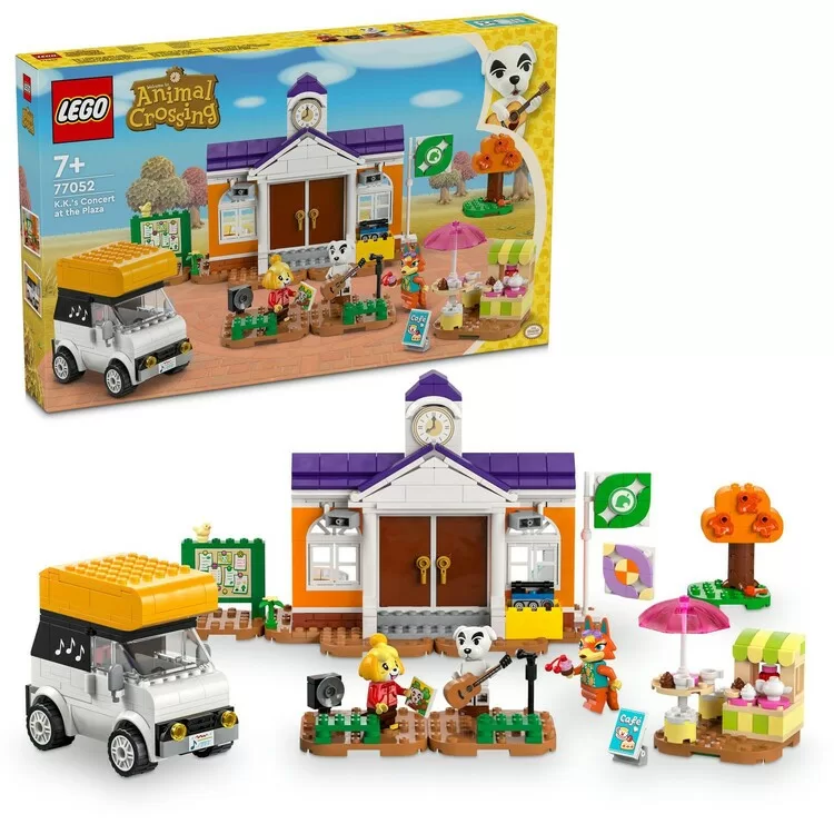 Holky a kluci ve věku od 7 let si se stavebnicí K.K. a koncert na náměstí (77052) vymyslí vlastní příběhy inspirované sérií videoher Animal Crossing™. Nejdříve si postaví scény z videohry a poté si mohou hrát se 3 minifigurkami LEGO® Animal Crossing a mnoha známými doplňky ze série těchto videoher, ať už je jejich představivost zavede kamkoli! Děti připraví koncert K.K. tak, že ze střechy karavanu přinesou jeho mikrofon, předstírají, že hrají na kytaru, nebo se připojí k Isabelle při skupinovém protahování. V kavárně si s Audie poví všechny novinky a pak se vydají na radnici, kde mohou získat vlastnoručně vyrobený leták s receptem, získat odměny v bankomatu a zkontrolovat krabici na tříděný odpad, jestli něco nepřibylo.