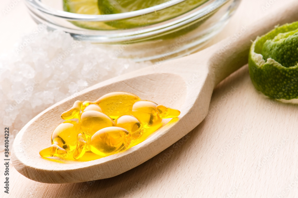 Fotografie lemon bath - bath salt, capsule and fresh fruits