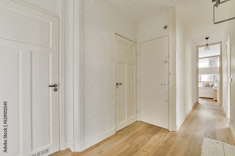 Fotografie Light narrow hallway with many doors in white walls and over lumber floor