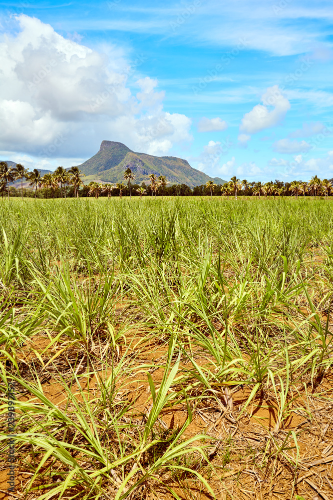 Fotografie Lion mountain with green sugar cane field foreground on the beautiful tropical p