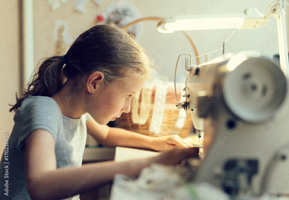 Fotografie Little girl working on sewing machine at home.