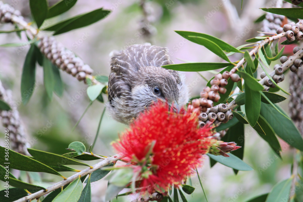 Obraz na plátně Little Wattlebird fledgling (Anthochaera chrysoptera) in Bottlebrush tree, South