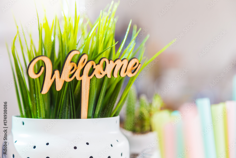 Obraz na plátně little wooden welcome sign in a white plant pot