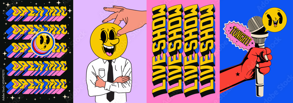 Fotografie Live open mic event or stand up comedy show poster set in bright colors with 3d typography composition and microphone