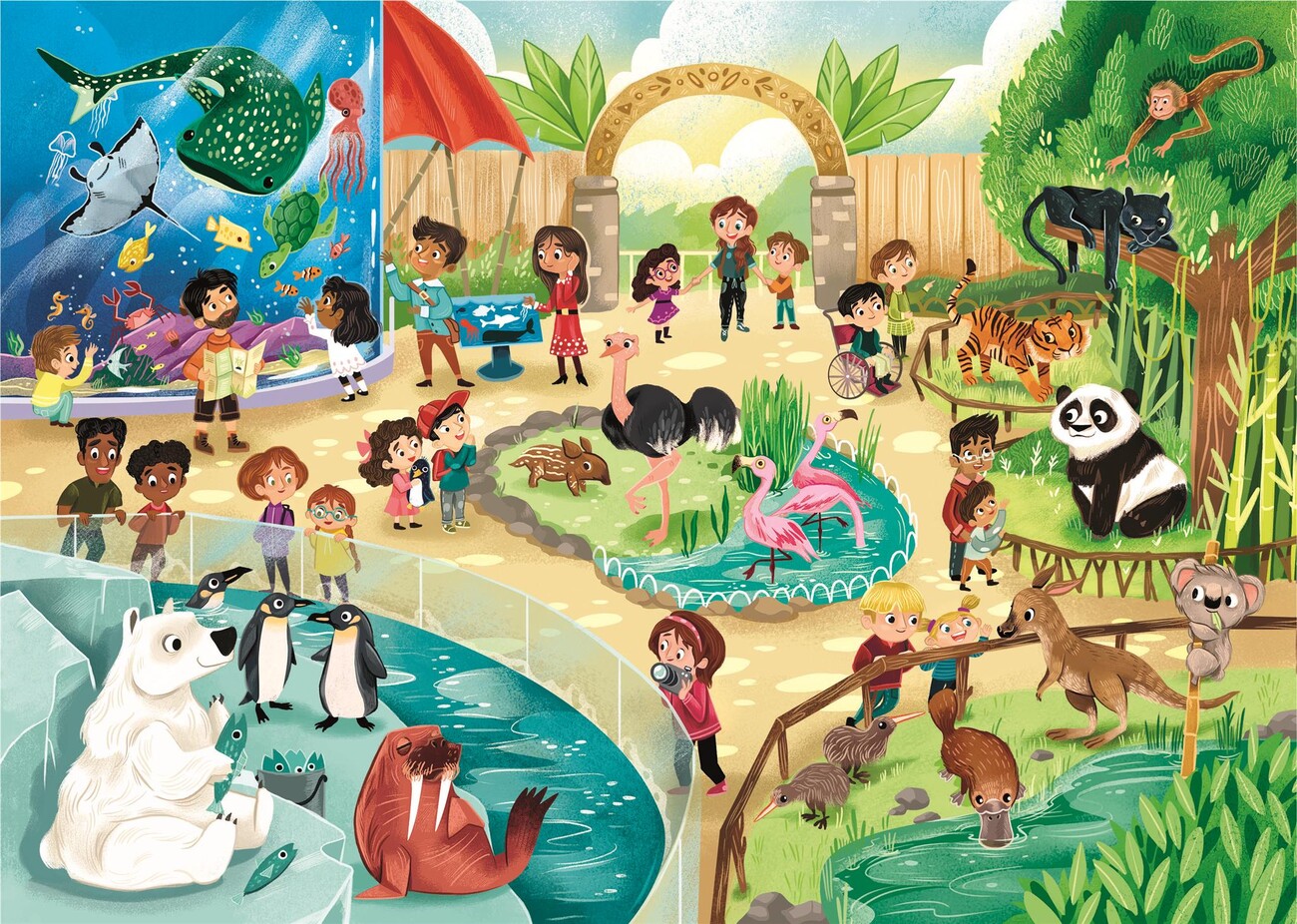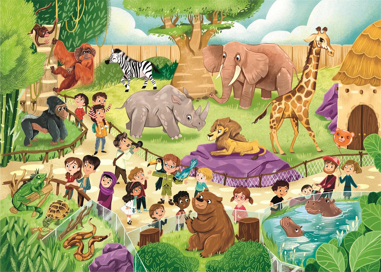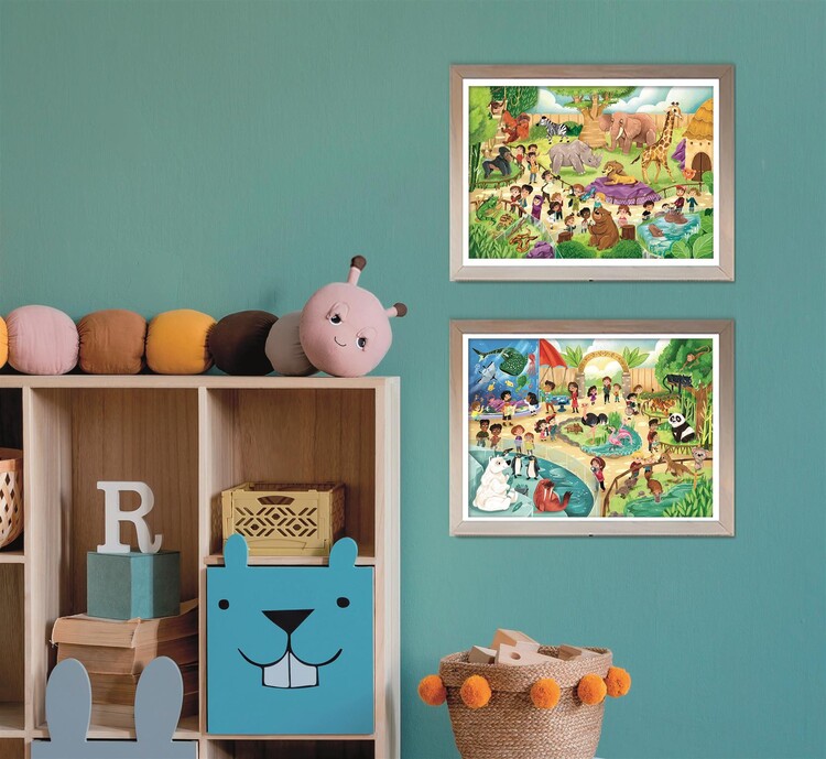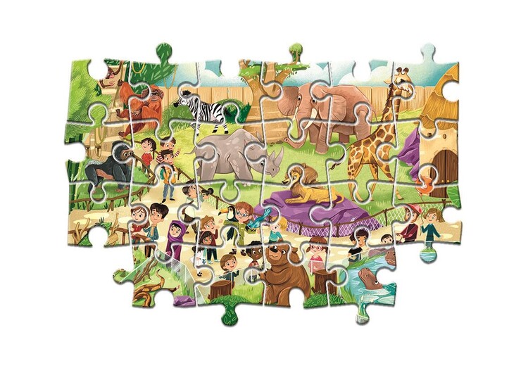 Dvoje puzzle ze života v zoo (2×60 dílků). Veselé scény vybízejí k pozorování a učení se o zvířatech. Jasné barvy usnadňují třídění, přesně tvarované dílky do sebe plynule zapadají. Puzzle Clementoni vynikají ostrostí tisku a přesným výsekem, perfektně lícují, takže skládání jde skoro samo. Baleno v robustní, elegantní krabici.