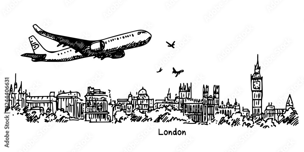 Obraz na plátně London skyline with airplane and landmarks doodle sketch black vector engraving