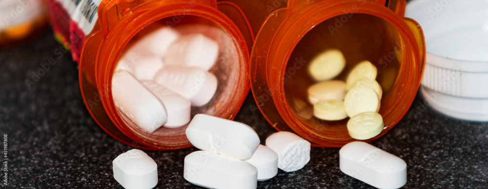 Fotografie Looking into two prescription pill bottles with white and yellow pills on a dark