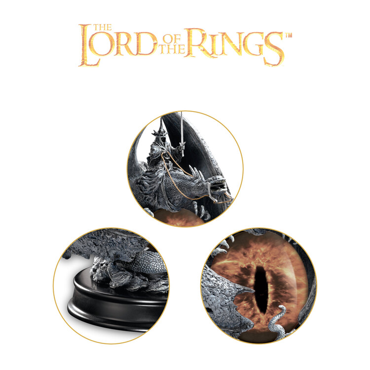 Nádherná socha z Pána prstenů zobrazuje Krále čarodějnic na okřídleném drakovi. Integrované skleněné sklo se Sauronovým okem