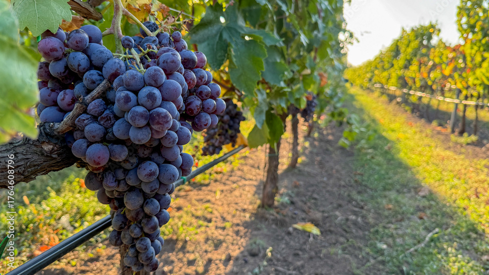 Fotografie Lush vine-kissed grapes basking under golden sunlight, embody autumn harvest fes