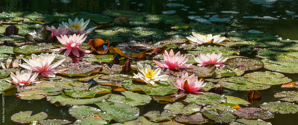 Magical garden pond with pink and white blooming water lilies and lotus flower Marliacea Rosea after rain. Close-up of nympheas on sunny background. Selective focus