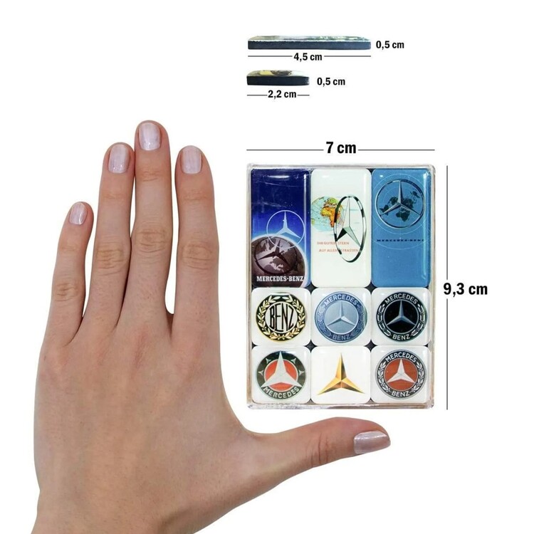 Sada 9 výkonných magnetek: 6× čtverec 2,2×2,2 cm a 3× obdélník 2,2×4,5 cm. Pestré motivy s odolným, lesklým epoxidovým povrchem, který chrání potisk a zvýrazní barvy; ideální na lednici, digestoř a jiné kovové plochy.