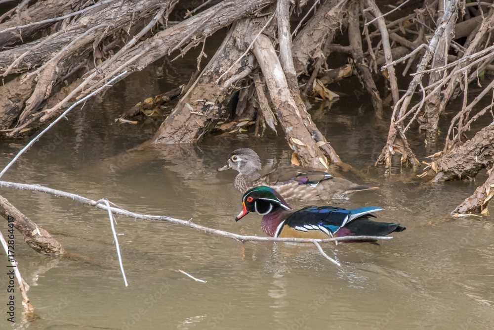 Fotografie Male and female wood ducks in water near Rio Grande Nature Center, Albuquerque,