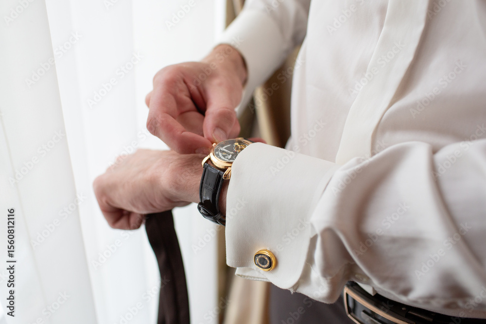 Fotografie Man adjusting watch on wrist with cufflinks visible