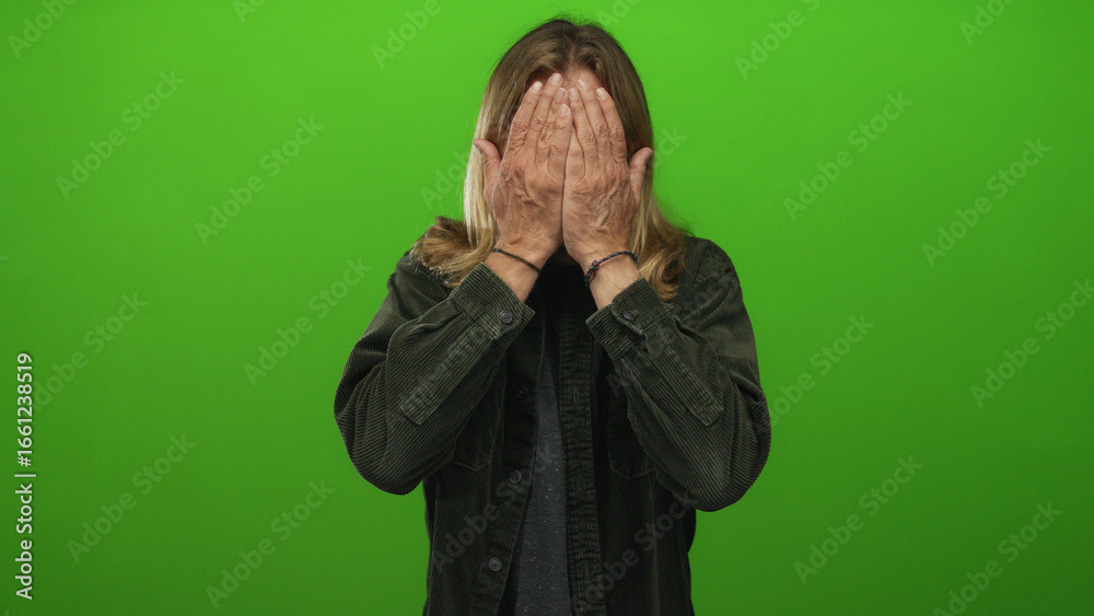 Fotografie Man covering face with hands against a green studio backdrop while smiling broadly and pulling back his long blond hair; surprise amusement
