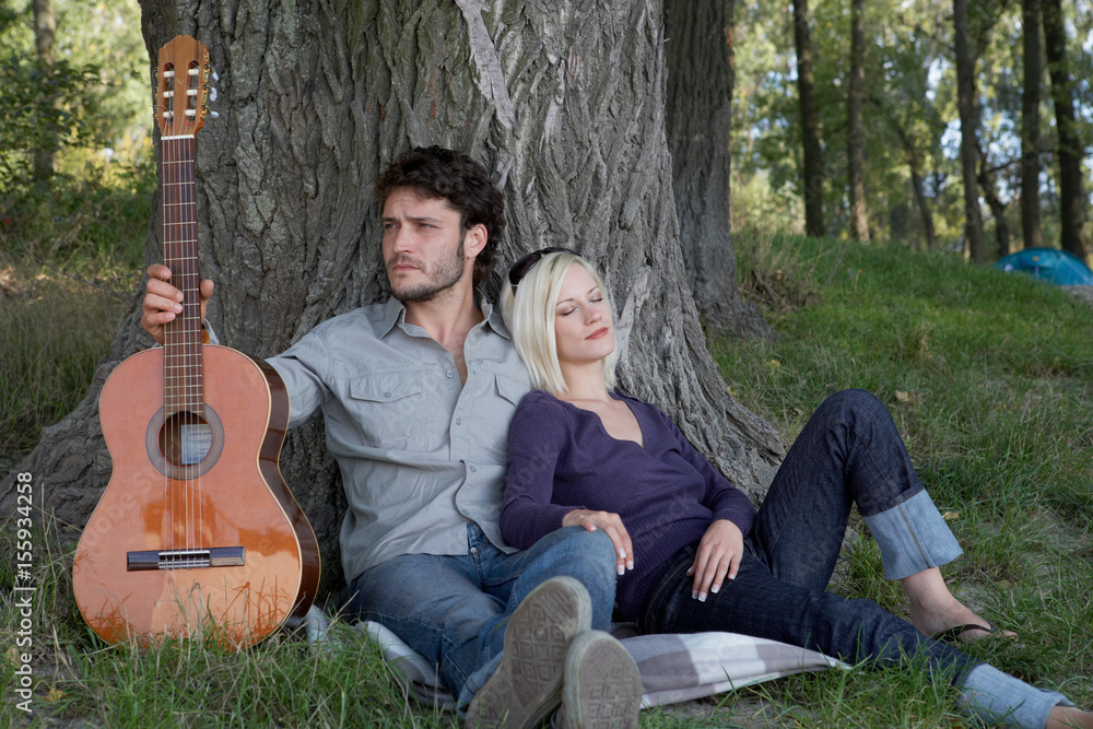 Fotografie Man holding a guitar with sleeping woman