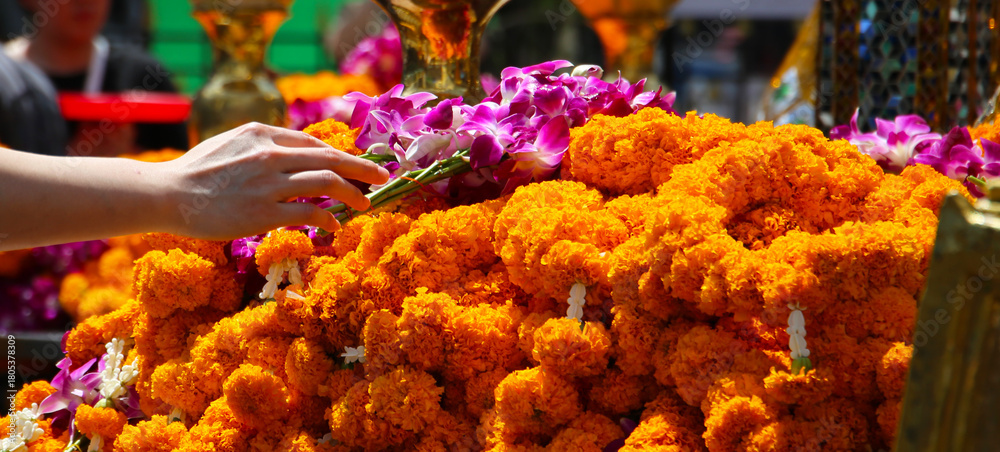 Fotografie Marigold garlands offered for worship at the Erawan Shrine in Bangkok, Thailand